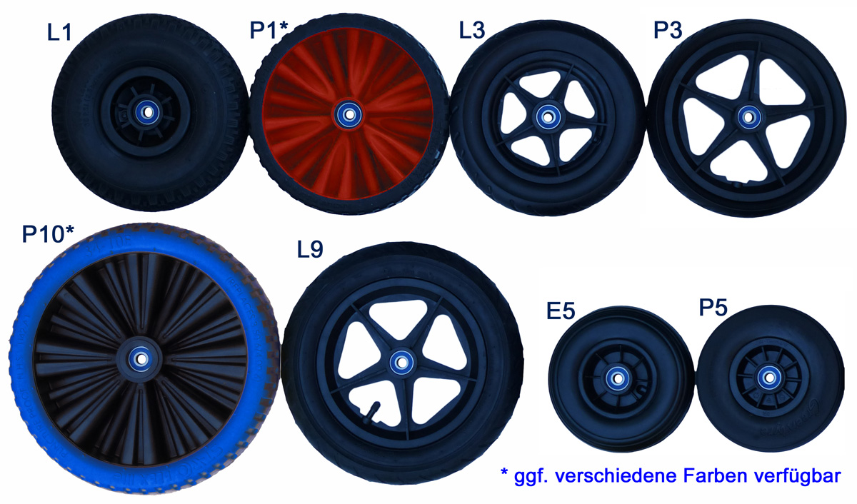 Unsere Wagen sind wahlweise mit Gummi-Luftbereifung (alle mit Autoventil) oder mit  pannensicheren PUR- oder EVA-Rädern erhältlich. Die Lufträder haben den höchsten Rollkomfort und die robustere Laufflächen, die Schaumräder sind dafür unplattbar, haben aber auch eine geringere Tragfähigkeit und haben geringere Tragfähigkeiten insbesondere bei erhöhten Temperaturen und federn schlechter.Das robustete Rad ist das Luftrad L1 im klassischen Sackkarrenformat, gefolgt von den Leichtlauf-Lufträdern L3 und L9. Dem Restrisiko eines Reifenplattens (insbesondere bei L1 extrem selten), kann man mit einer kleinen Dose Pannenspray vorbeugen.